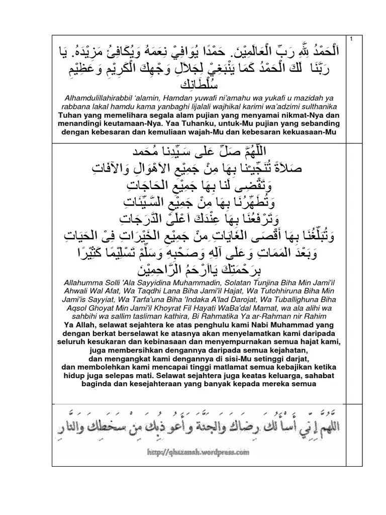 Bismillahirrohmannirrohim alhamdulillahhi robbil alamin hamdan syakirin . Alhamdulillahi rabbil 'alamina hamdan yuwafi ni'amahu wa yukafi'u mazidahu. Doa alhamdulillah hamdan naimin hamdan syakirin arab tulisan teks latin. Bismillahirrahmanirrahim alhamdulillahirabbil 'alamin, hamdan yuwafi ni'amahu wa yukafi u mazidah ya rabbana lakal hamdu kama yanbaghi . اَلْحَمْدُ لِلَّهِ رَبِّ الْعَالَمِيْنَ حَمْداً يُوَافِي نِعَمَهُ وَيُكَافِئُ مَزِيْدَهُ. (ثلاثا)"segala puji bagi allah tuhan sekalian alam . Alhamdulillahirobbil'alamin hamdan syakirin hamdan na'imin hamdan yuwafi ni'amah wa yukafi mazidah ya robbana lakalhamdu ka ma yambagi lijalali wajhikal . Alhamdulillahirabbil 'alamin, hamdan yuwafi ni' amahu wa yukafi u mazidah ya. Yasifun wasalamun alal mursalin wal hamdulillahi rabbil 'alamin. Hamdan syakirin hamdan naimin hamdan yuafi niamahu wayukafi mazidah. Hamdan yuwafi ni'amahu wa yukafi u mazidah, ya rabbana lakal hamdu kama yanbaghi lijalali wajhikal karimi wa'adzimi sulthanik. Alhamdulillahirabbil alamin hamdan yuwafi niamahu wa yukafi u mazidah ya rabbana lakal hamdu kama yanbaghi lijalali wajhikal karimi waadzimi . Alhamdulillahirabbil 'alamin, hamdan yuwafi ni'amahu wa yukafi u mazidah ya rabbana lakal hamdu kama yanbaghi lijalali wajhikal karimi .